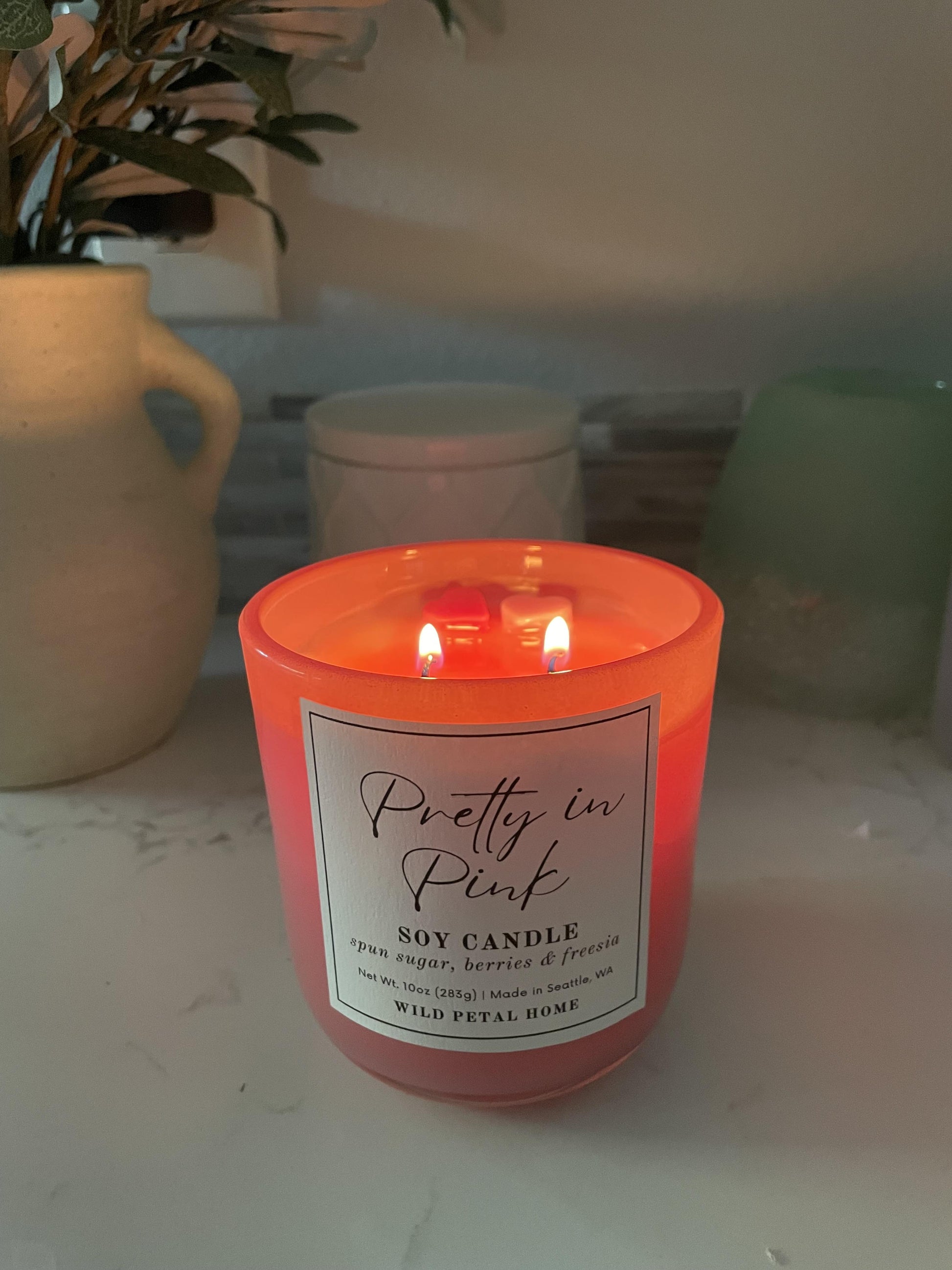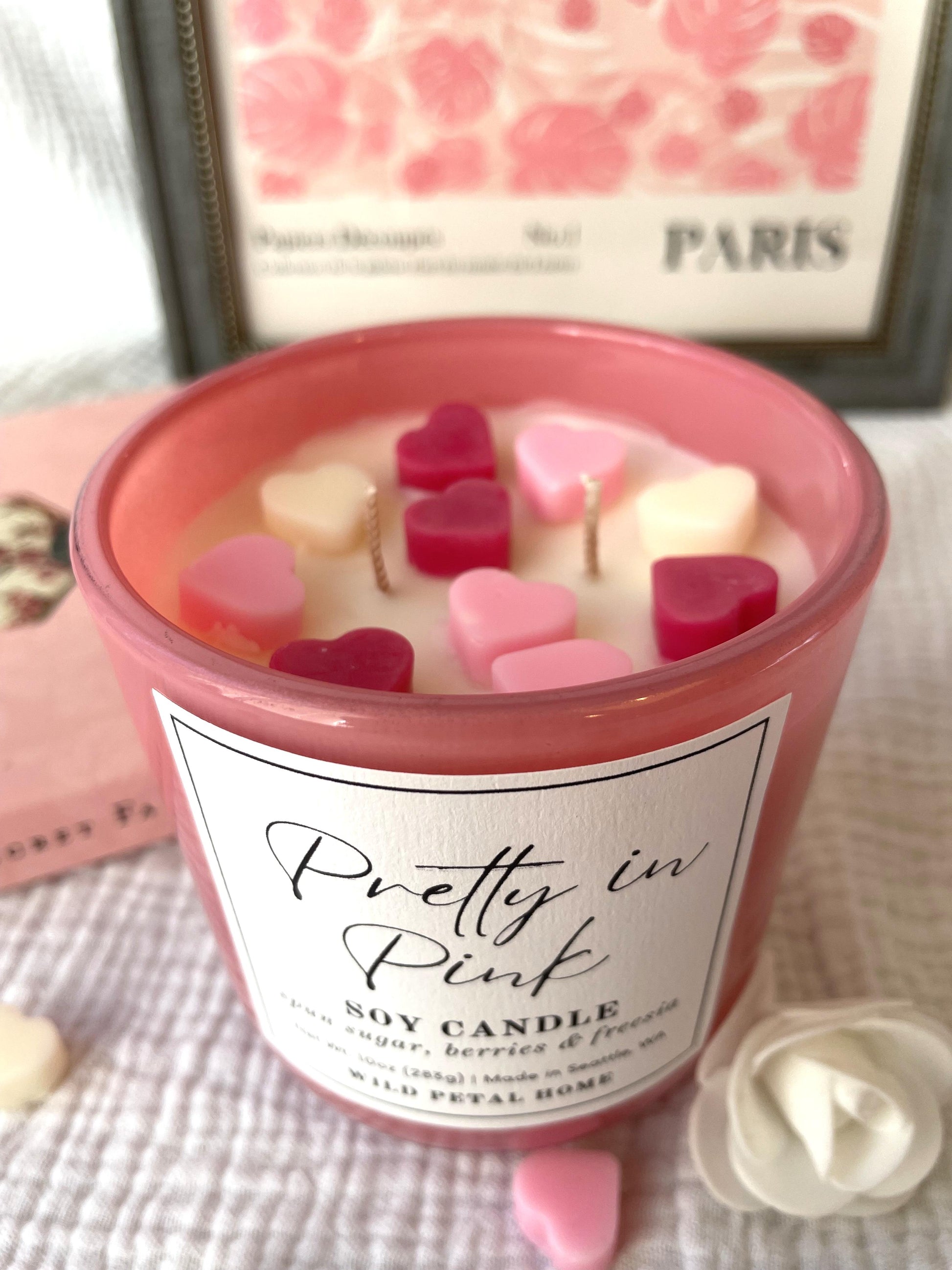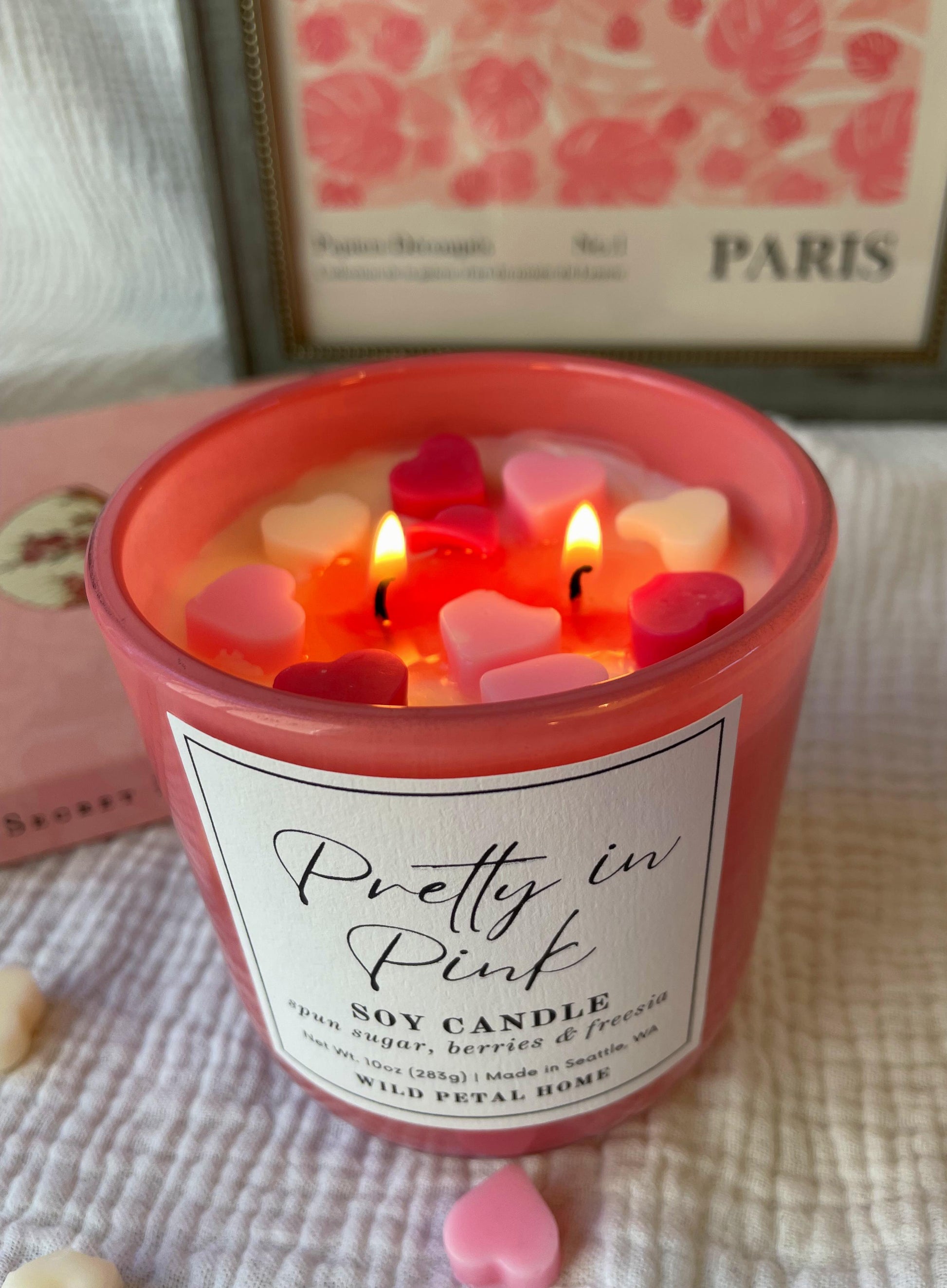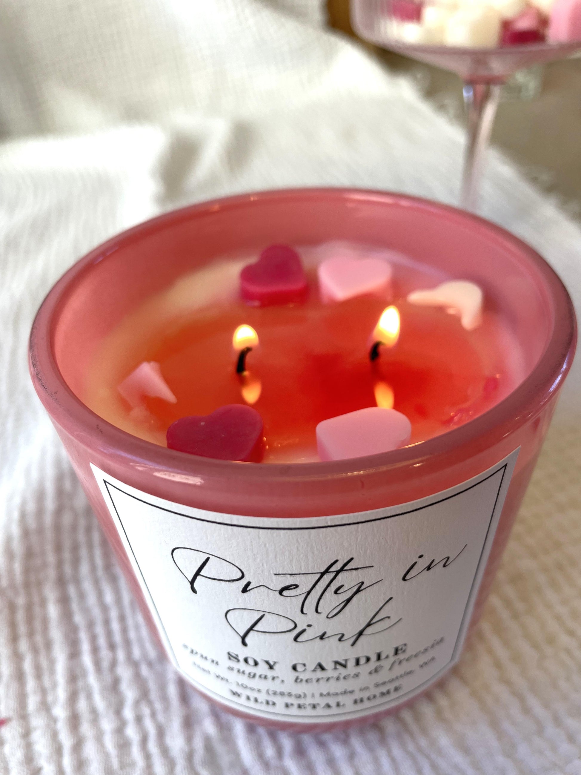 This candle is charming as it gets! Pink and white conversation hearts melt and mingle as the playful scent of cotton candy, berries and a touch of freesia floats in the air. Flirty and fun!
